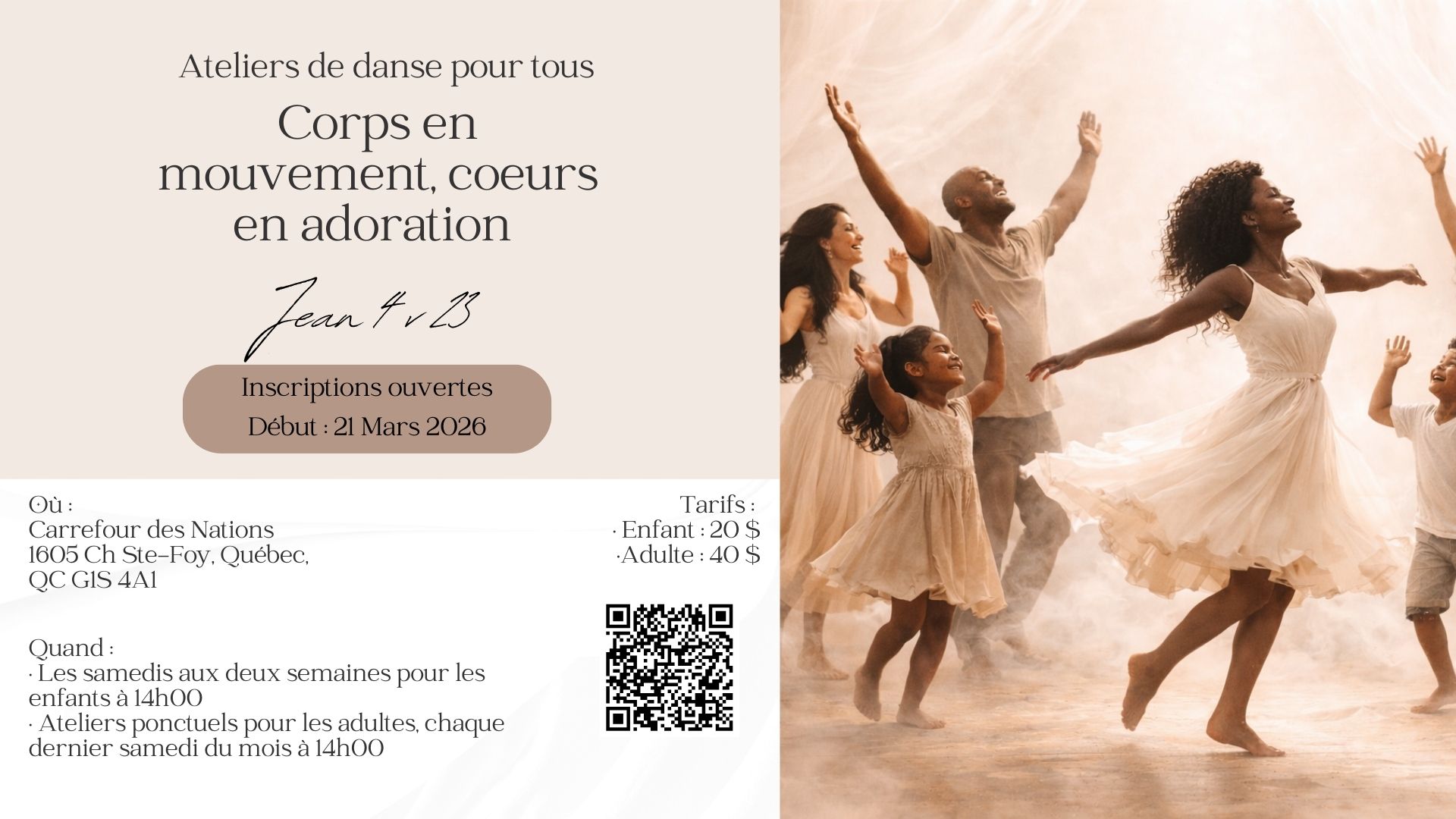Ateliers de danse pour tous: Corps en mouvement, coeurs en adorationJean 4:23 - Mais l'heure vient, et elle est déjà là, où les vrais adorateurs adoreront le Père en esprit et en vérité.Inscriptions ouvertesDébut des ateliers : 21 Mars 2026 Où: Carrefour des Nations, 1605 chemin Sainte-Foy Tarif:- Enfant : 20 $- Adulte: 40$ Quand:·Les… Lire la suite »Inscriptions – Ateliers de danse pour tous