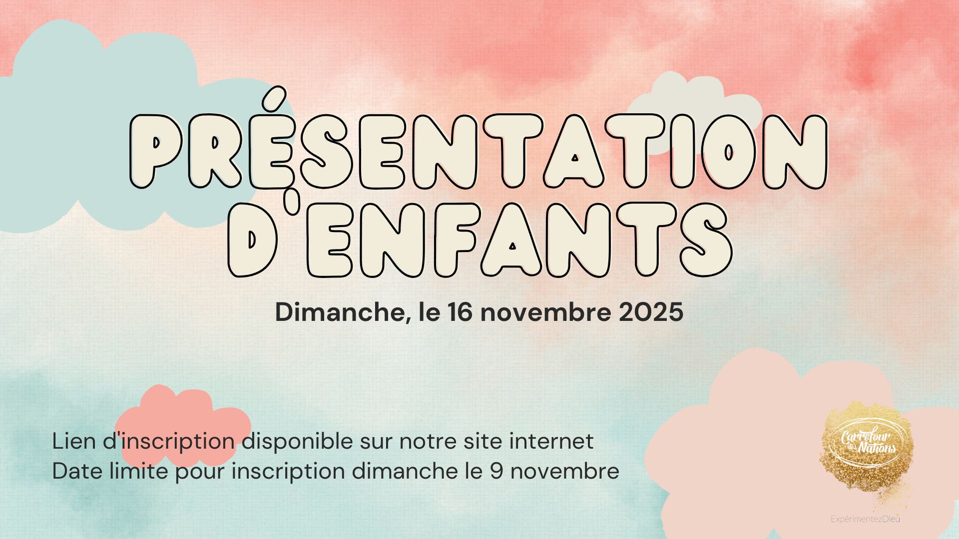Et Jésus dit: Laissez les petits enfants, et ne les empêchez pas de venir à moi; car le royaume des cieux est pour ceux qui leur ressemblent. Matthieu 19:14 Vous faites partie du Carrefour des Nations et vous désirez présenter votre(vos) enfant(s). Le dimanche 15 juin nous prendrons un temps pour présenter les enfants à… Lire la suite »Présentation d’enfants Dimanche le 16 novembre – Inscription requise – veuillez cliquer sur l’évènement pour inscription