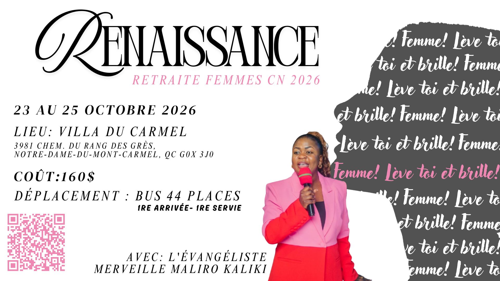 INFORMATIONS POUR LA RETRAITE: Date: 23 - 24 - 25 octobre 2026 Thème: RENAISSANCE Femme ! Lève-toi et Brille ! Esaïe 40:31 - 2 Cor 5:17 Avec: l'Évangéliste Merveille Maliro Kaliki Lieu: Villa du Carmel, 3981 Chem. du Rang des Grès, Notre-Dame-du-Mont-Carmel, QC G0X 3J0 Coût: 160 $ Déplacement : bus 44 places