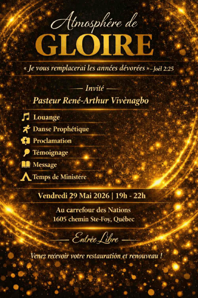 Prière, louange et plus..L’orateur de la soirée sera pst René-Arthur.Plus de détails sur l’affiche plus bas.