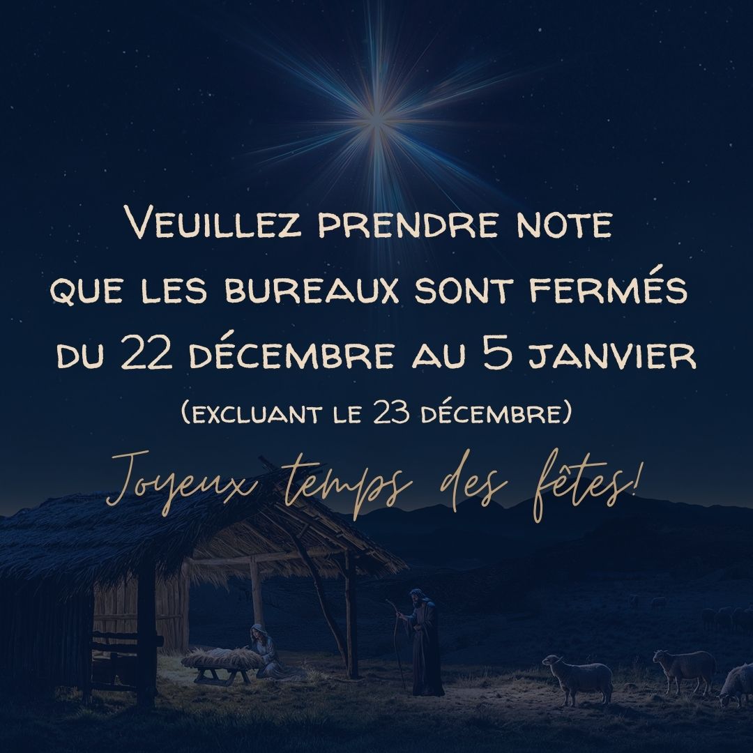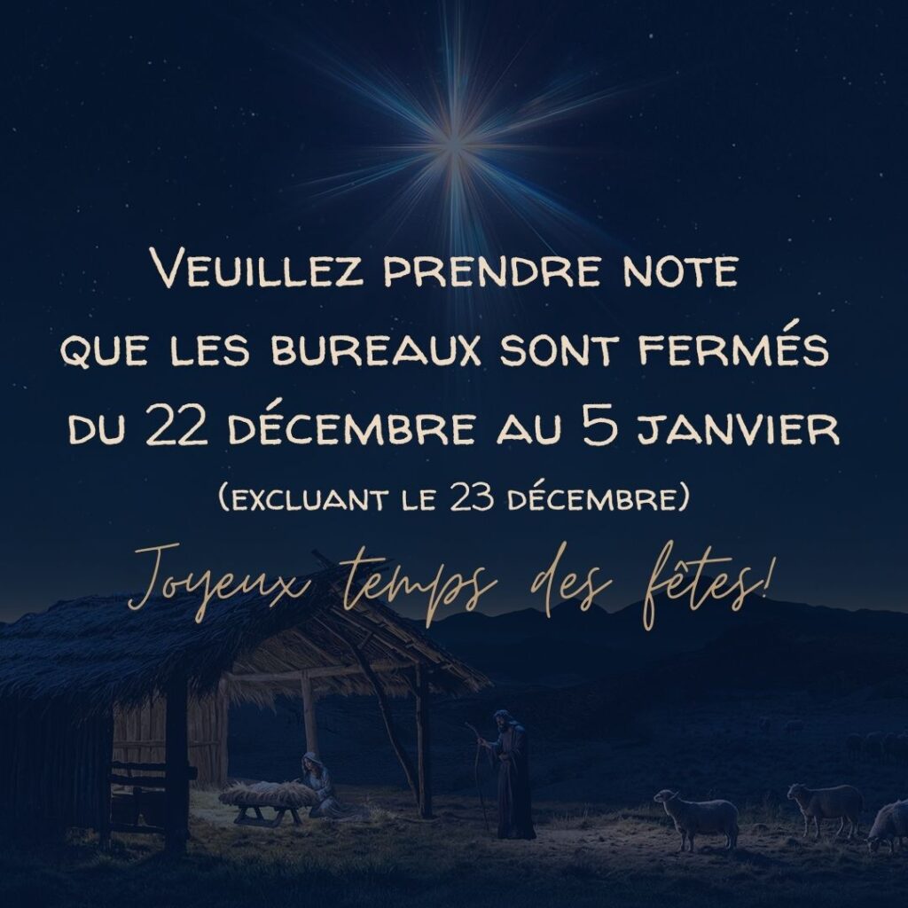 Veuillez prendre notes que les bureaux seront fermés du 22 décembre au 2 janvier, excluant le 23 décembre où nous pourrons répondre à vos courriels et vos appels.