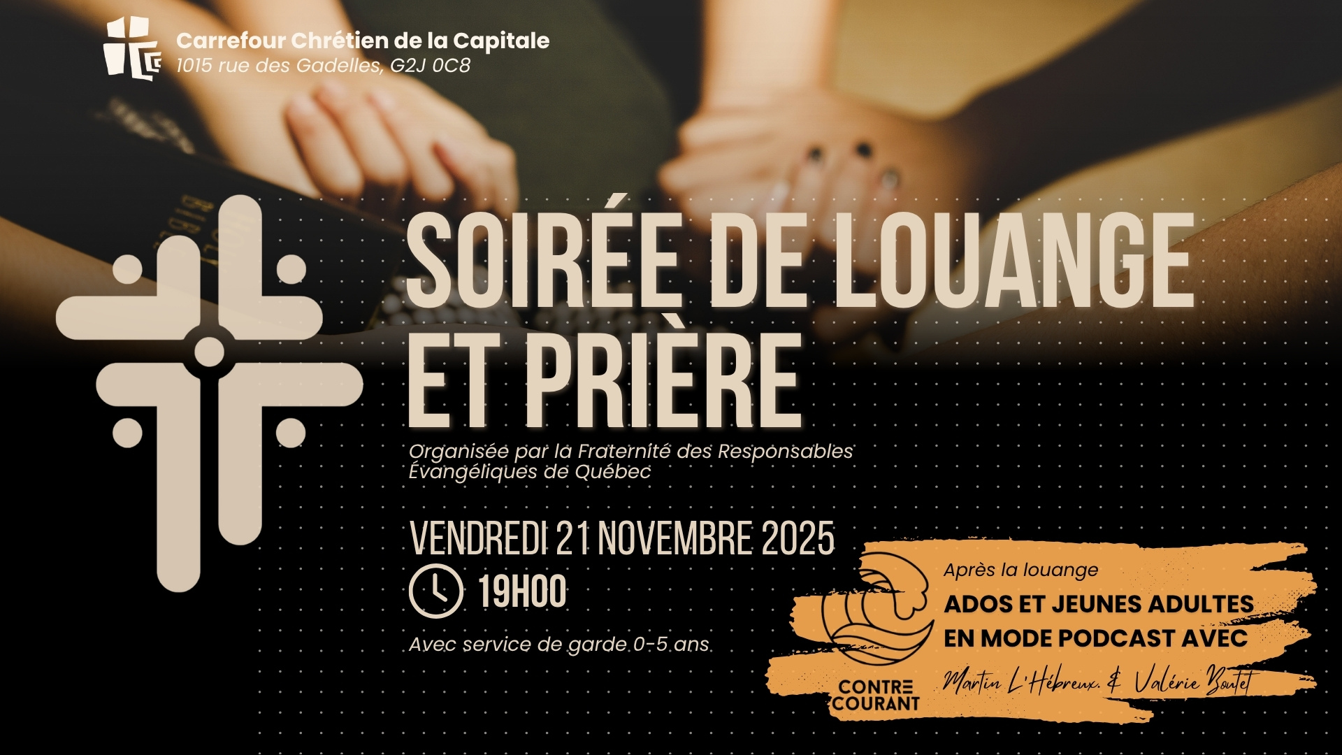 Temps de prière et intercession. Ouverture des portes de 18:30 à 19:00.
