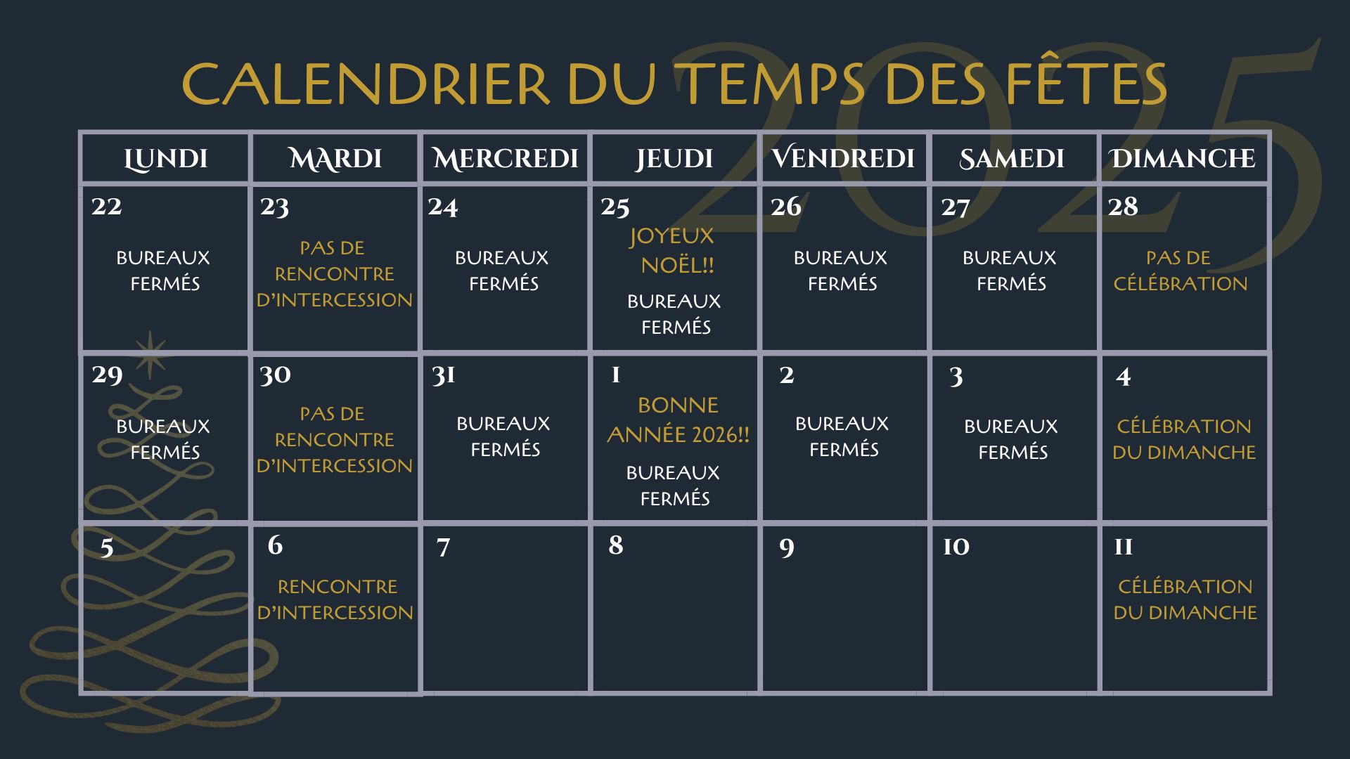 Veuillez prendre notes que les bureaux seront fermés du 22 décembre au 2 janvier, excluant le 23 décembre où nous pourrons répondre à vos courriels et vos appels.Important qu'il n'y… Lire la suite »Horaire spécial du temps des fêtes 2025