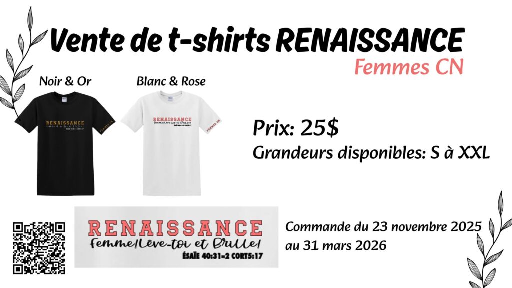 Pré-vente de T-Shirts Renaissance Femmes CNDisponible en Noir & Or et en Blanc & Rose.Grandeurs disponibles: S à XXLPrix: 25$Vous avez jusqu’au 31 mars pour faire votre commande.